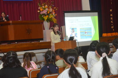 その後の講演会では本校卒業生のTUYアナウンサーの大内希美さんより「『夢を叶えること』よりも大切なことって何?」といった演題でお話をいただきました。